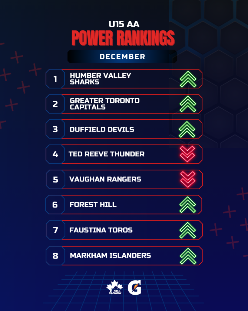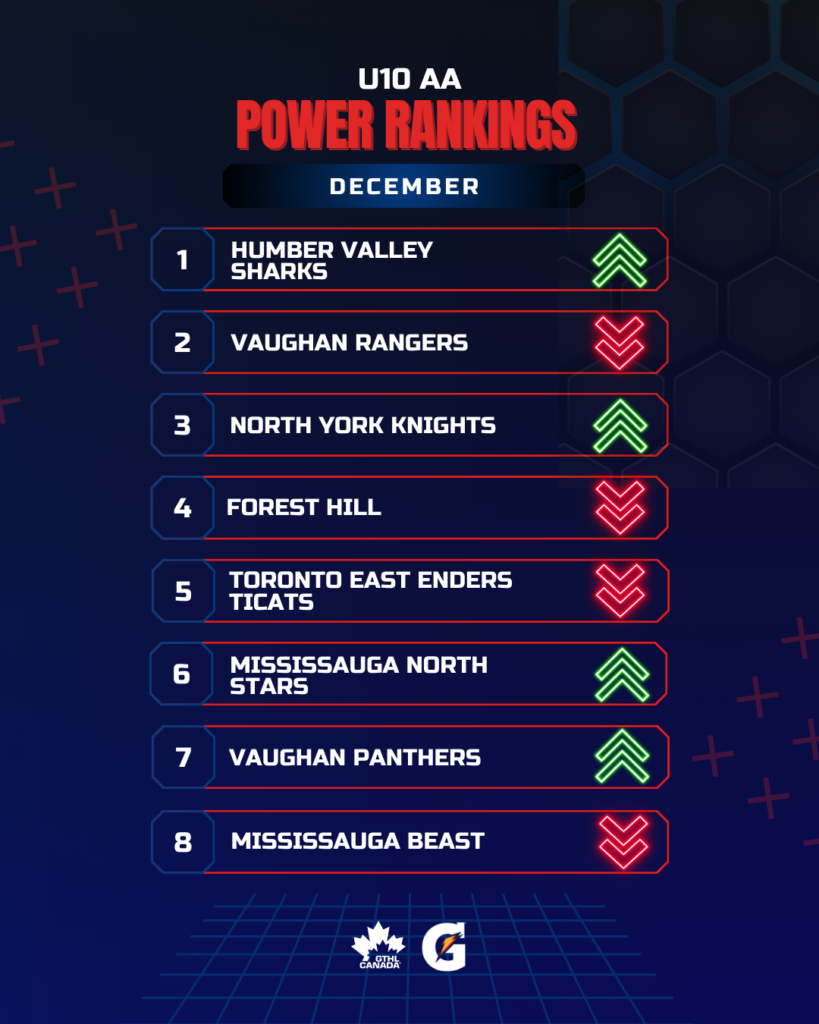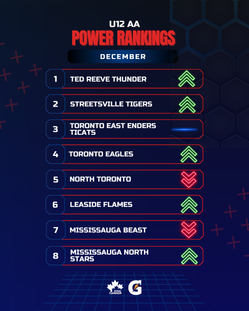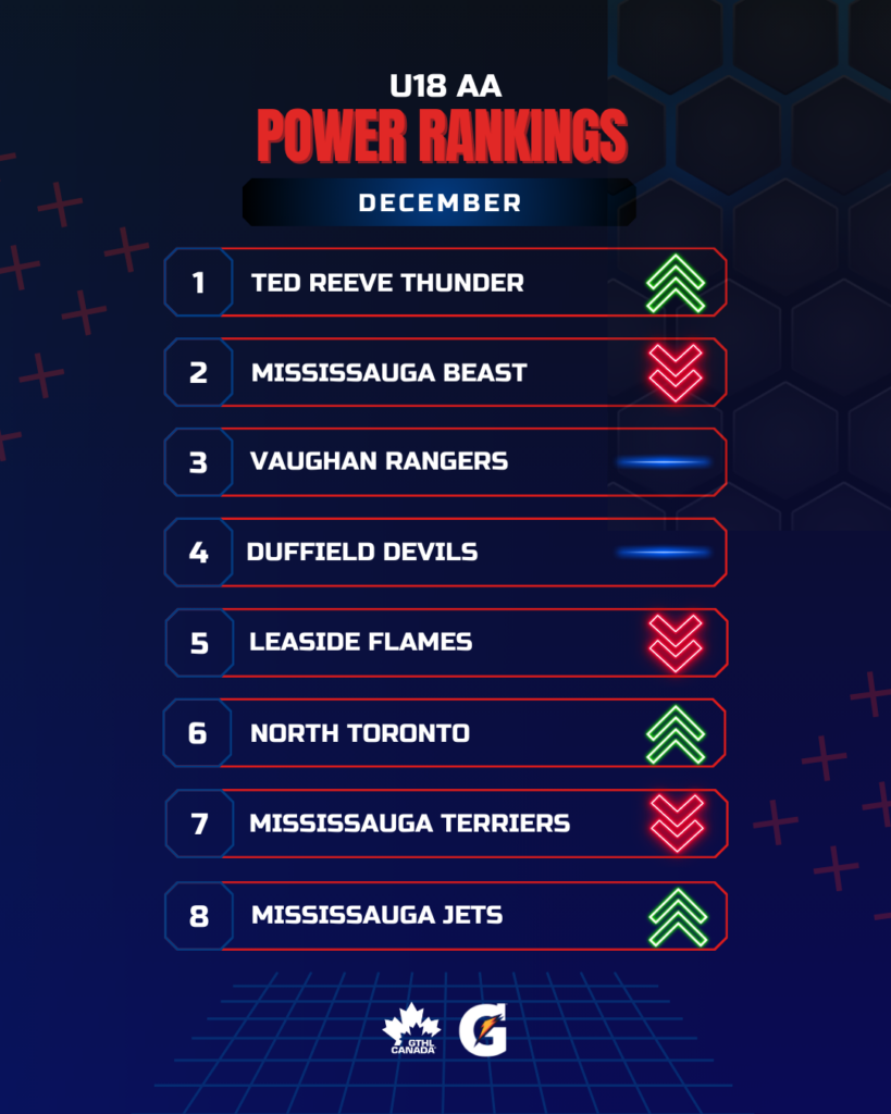 The Greater Toronto Hockey League Power Rankings cap off the 2025 portion of the season with a look at December. The GTHL Power Rankings, as a fun opportunity to highlight and celebrate teams’ accomplishments each month over the course of the season, feature the top eight teams across all competitive levels (‘A,’ ‘AA,’ and ‘AAA’) from Under-10 to U18.