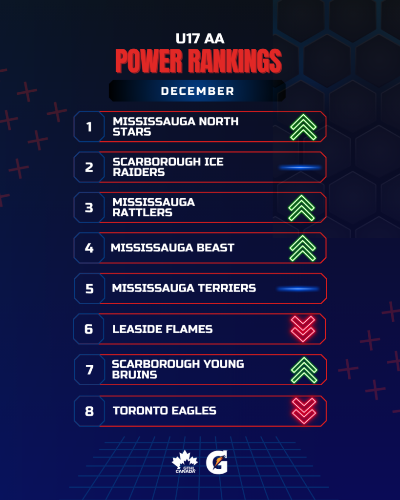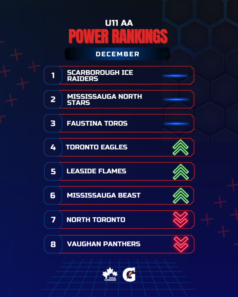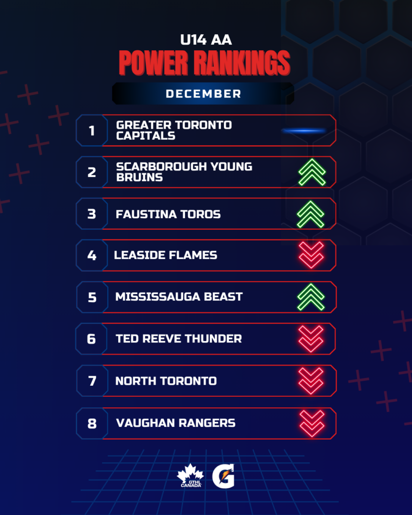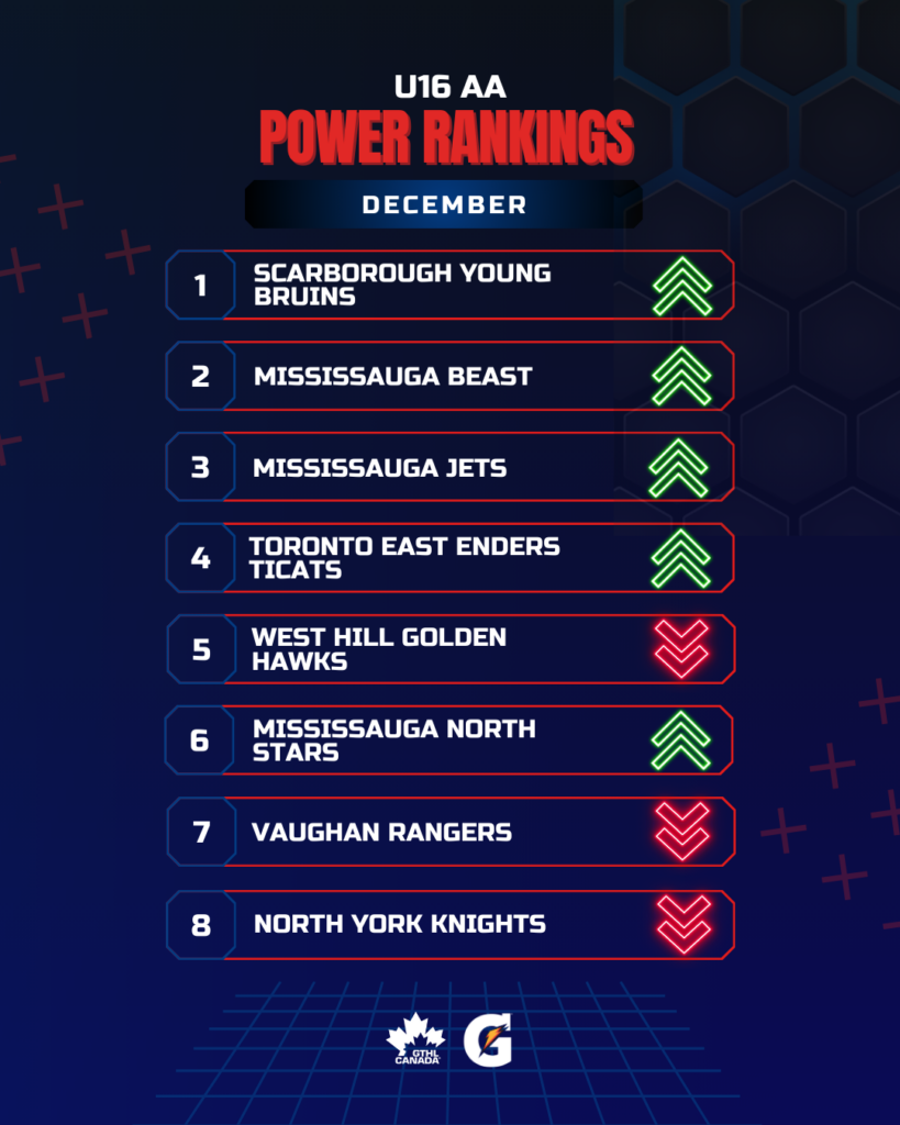 The Greater Toronto Hockey League Power Rankings cap off the 2025 portion of the season with a look at December. The GTHL Power Rankings, as a fun opportunity to highlight and celebrate teams’ accomplishments each month over the course of the season, feature the top eight teams across all competitive levels (‘A,’ ‘AA,’ and ‘AAA’) from Under-10 to U18.