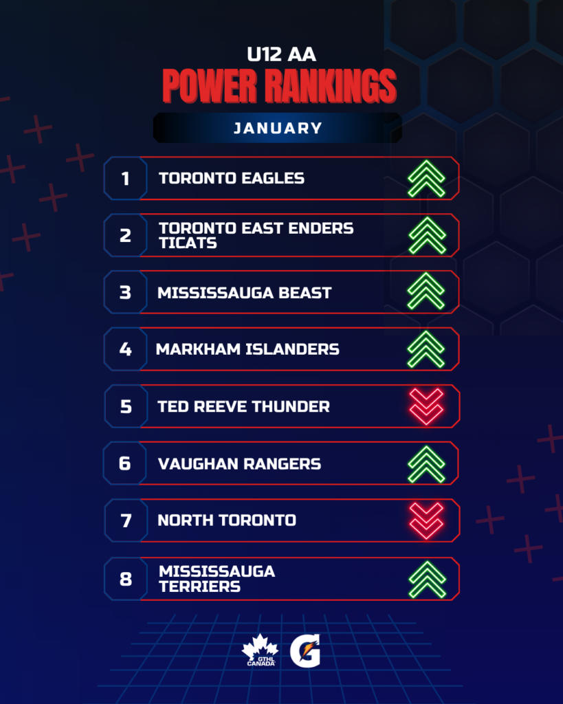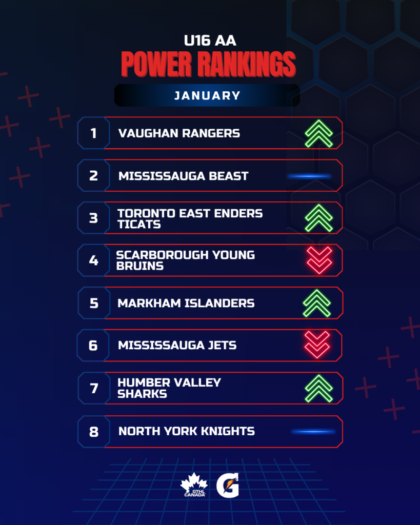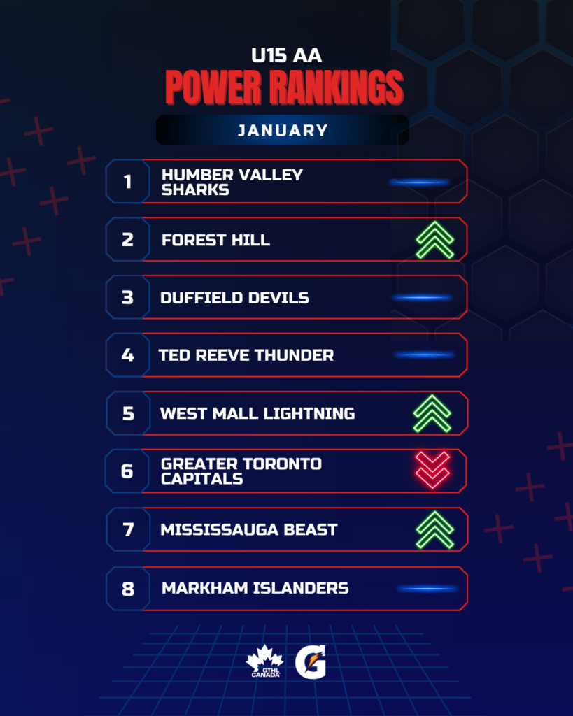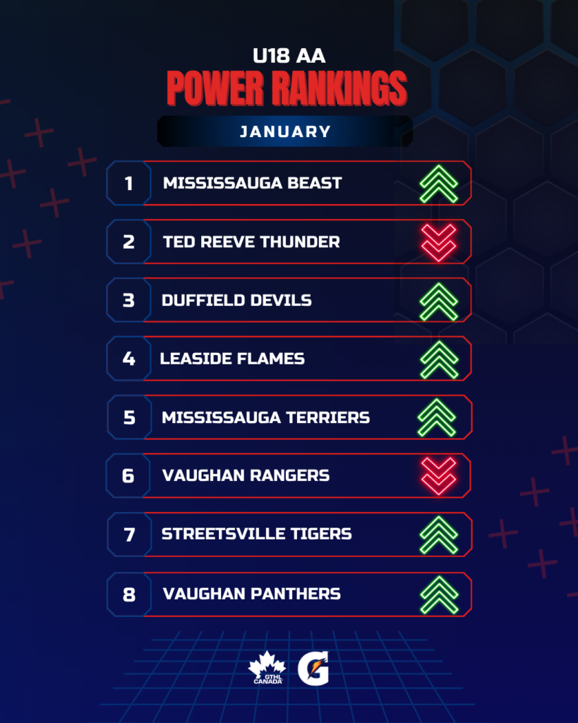 The Greater Toronto Hockey League Power Rankings kick off the second half of the 2025-26 season with a look at January. The GTHL Power Rankings, as a fun opportunity to highlight and celebrate teams’ accomplishments each month over the course of the season, feature the top eight teams across all competitive levels (‘A,’ ‘AA,’ and ‘AAA’) from Under-10 to U18.
