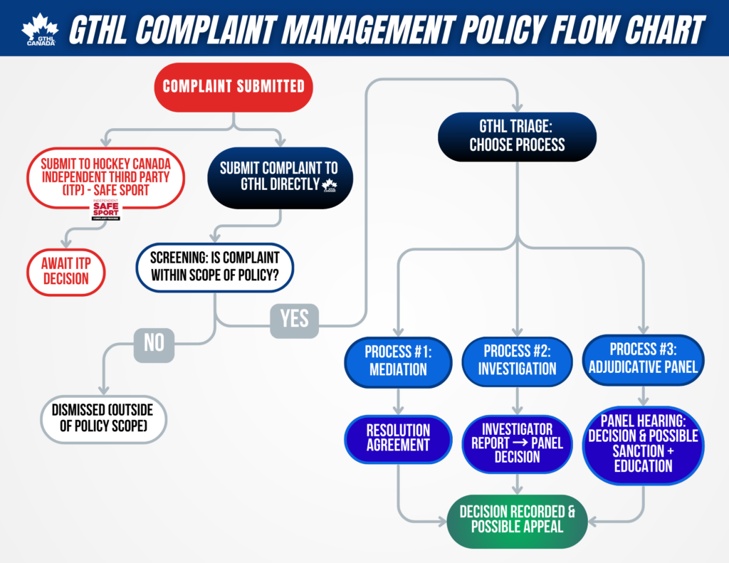 The GTHL Complaint Management Policy ensures that all players, coaches, officials, and participants have a safe, fair, and respectful environment. It provides a clear process for reporting and addressing complaints of maltreatment, harassment, bullying, and/or misconduct.