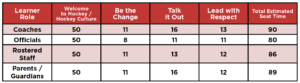 The time it will take to complete the program will vary depending on what role(s) the participant has in the hockey ecosystem and how intentional they are when taking each module. The below table outlines (in minutes) how long learners can expect the program to take: